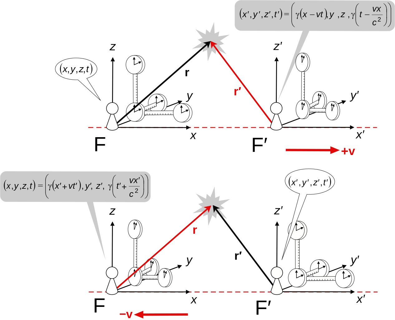 In the end of this post I would like to give the celebrated Lorentz transformations. Consider two observers moving with a constant relative speed along one particular direction (say along x axis), then the relation between the coordinates of the observers is (image courtesy Wikepedia)